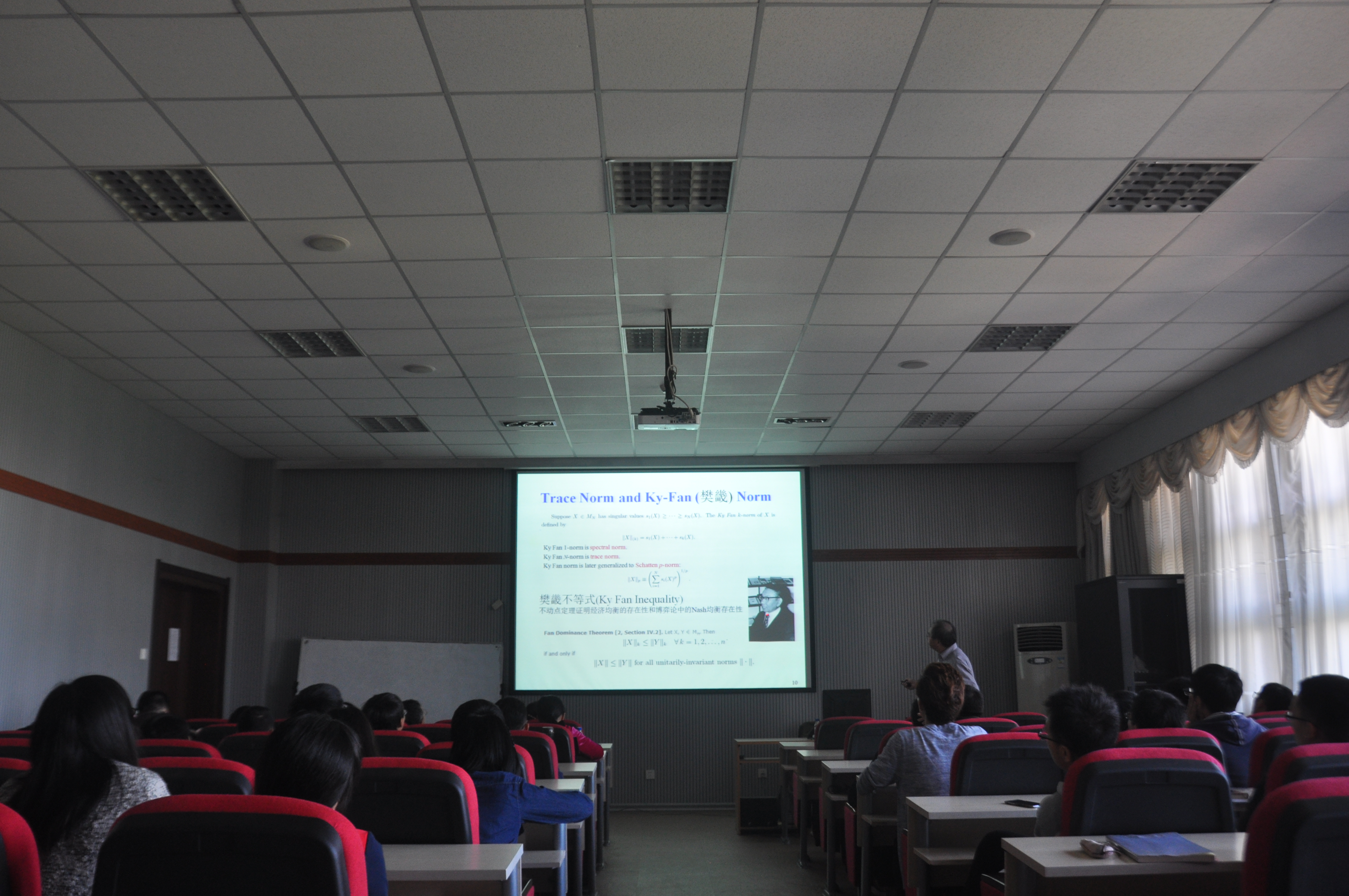 在这次讲座中,丁宏强教授首先简要介绍了他早年在哥伦比亚大学的研究成果和目前的研究内容;同时说明了机器学习需要用到的矩阵知识和基于矩阵的机器学习的早期工作,并针对现在主流的几种机器学习的矩阵公式以及相关算法进行了详细的介绍;最后,丁老师与在场师生进行了热烈的讨论,同与会老师交流了各自的观点,并解答了同学们的疑惑。讲座现场学术气氛十分浓厚,同学与老师之间的互动非常充分。