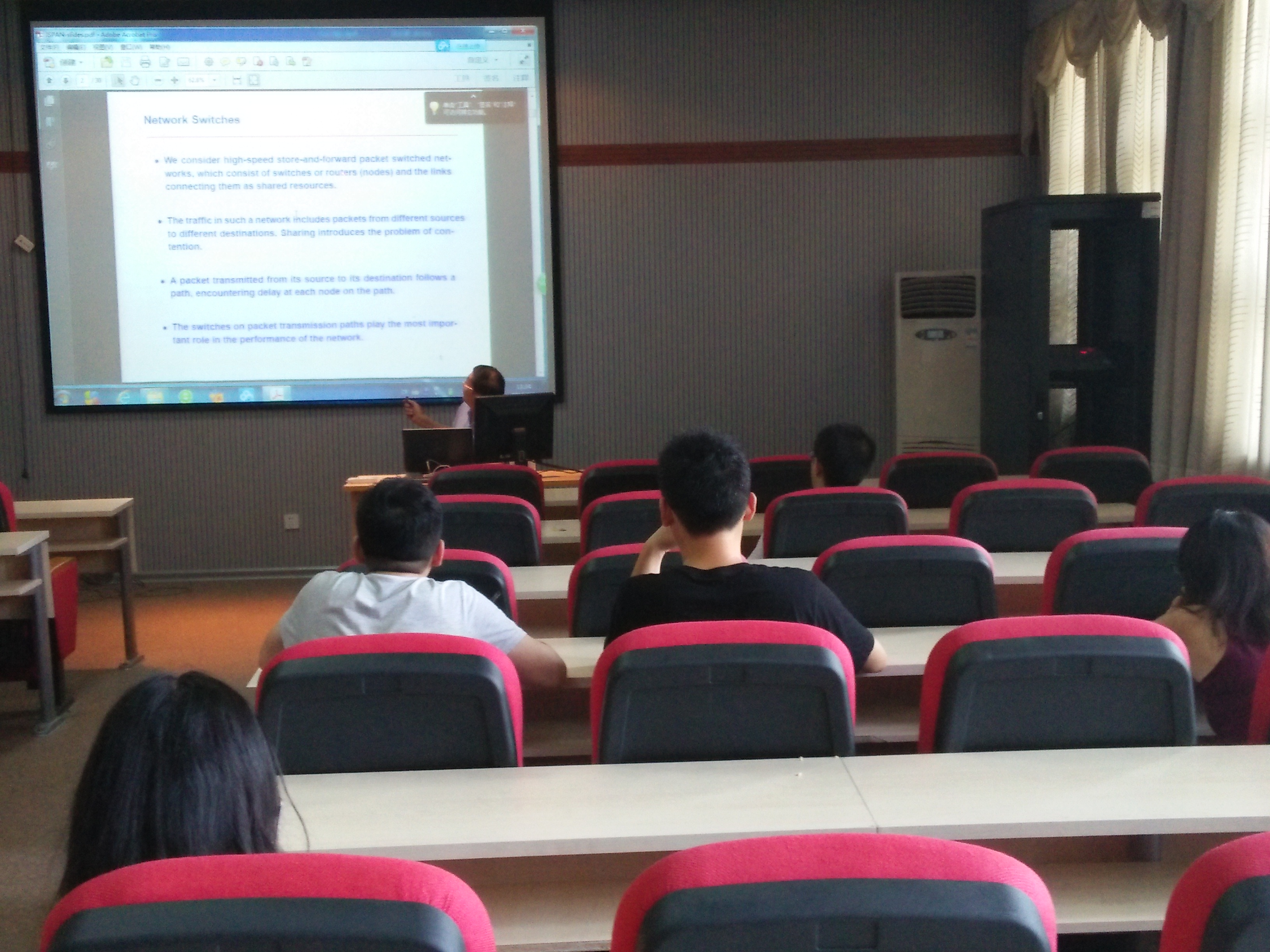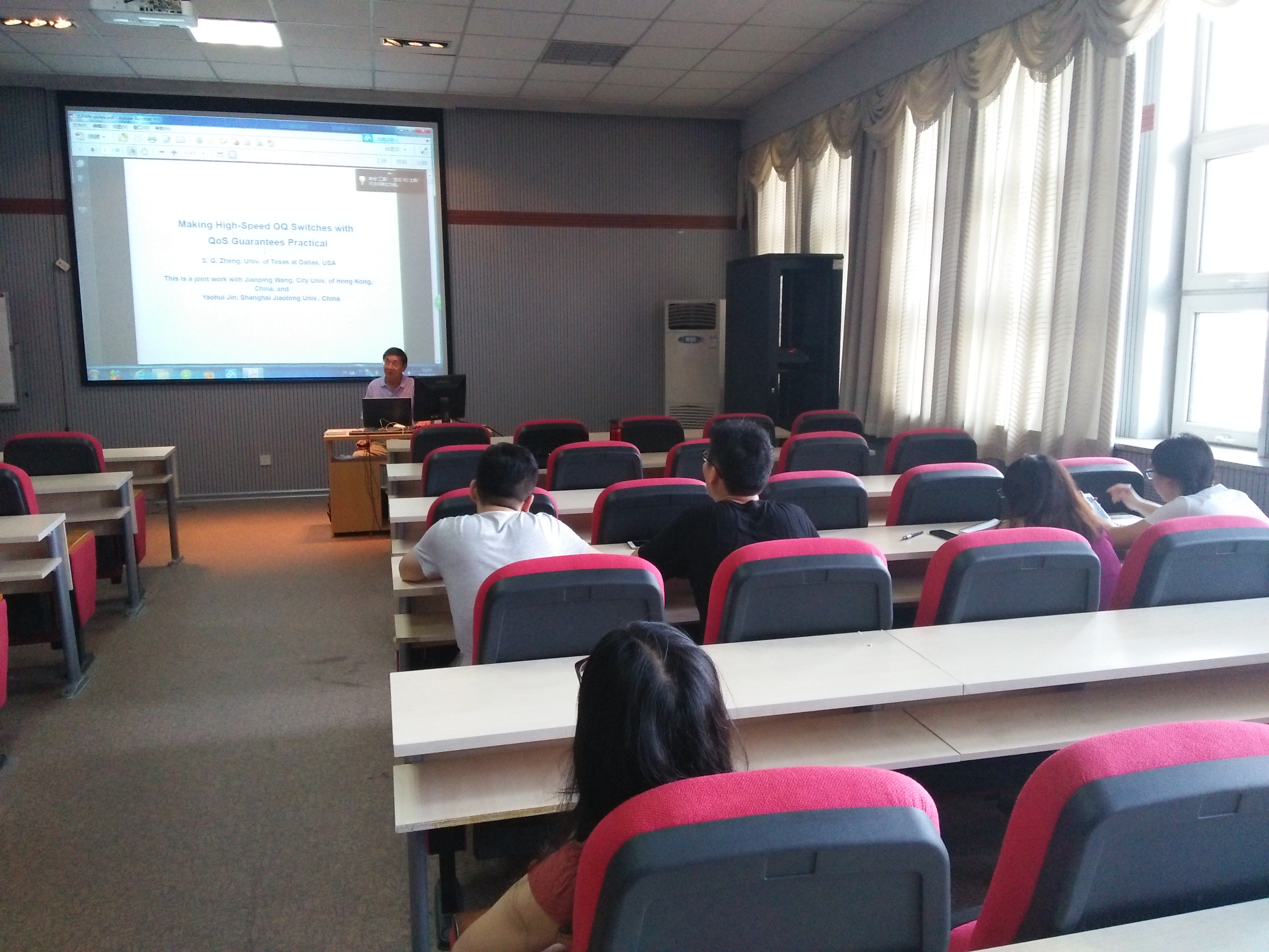 的青年教师和研究生做了题为“Making High-Speed OQ Switches with QoS Guarantees Feasible”的学术讲座。该讲座的主要内容源于近期郑斯清教授与香港城市大学、上海交通大学合作研究的学术成果 – 构建易实现的高速输出排队交换结构。郑斯清教授同时在报告中讲解了研究和开发高速和可扩展交换结构的技术难点,以及介绍了该方面近十年的研究进展。整个讲座大约持续3个小时,分为两个阶段,主讲阶段约进行2个小时。主讲结束后,郑斯清老师解答了同学们提出的该方面的相关问题,同时,和同学们讨论了学术研究过程中寻找课题、研究方法等。