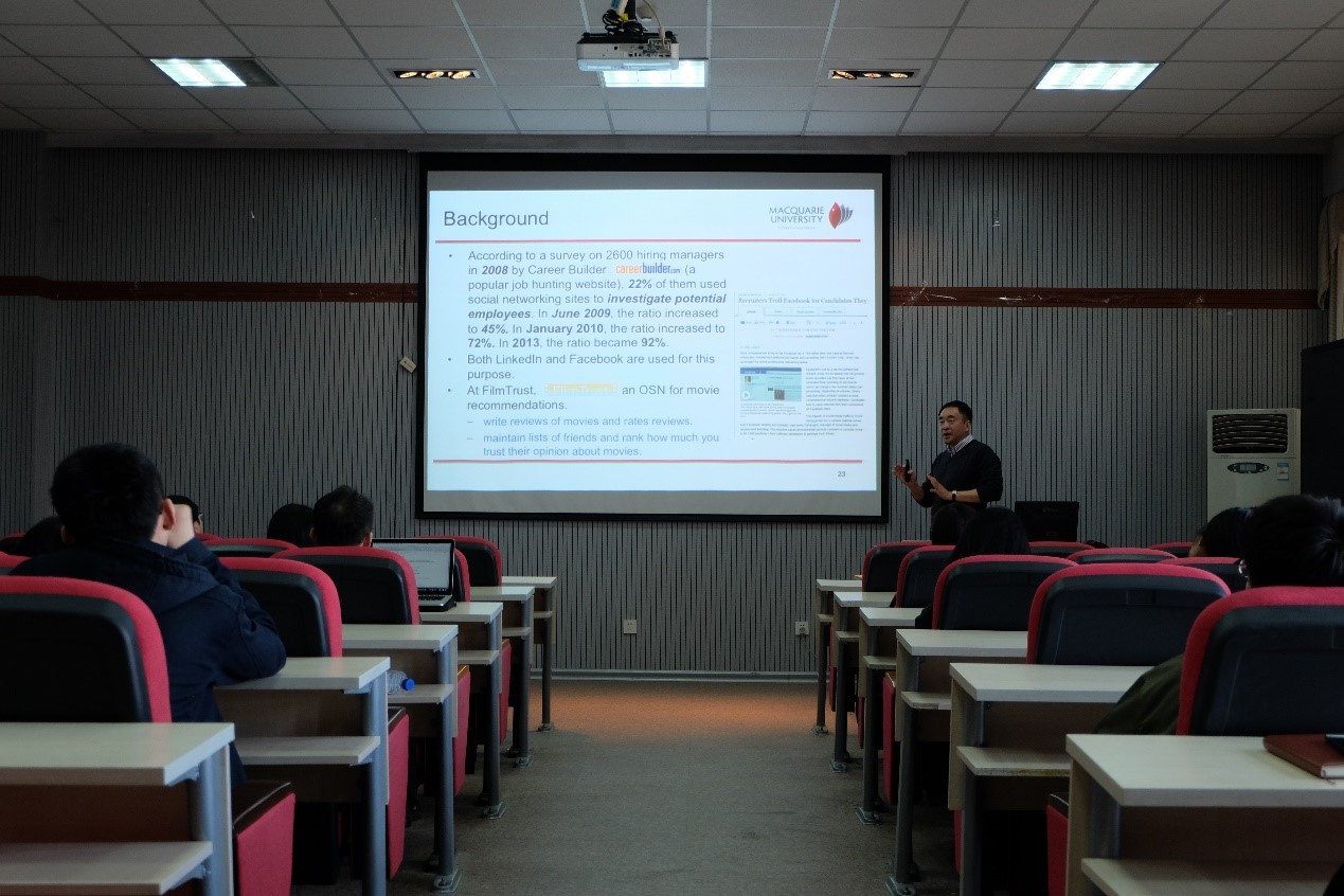 本次讲座主要讲解社会网络中的信任管理和在电子商务中的应用。讲座开始,介绍了博士生奖学金及双博士项目。之后根据当前社交网络和功能网站特点,介绍了基于功能网站的新型社会网络,接下来介绍了一种用于复杂社交网络中面向信任的服务提供者选择的启发式算法和一种用于计算交易信誉概况的上下文感知方法。报告最后,王岩副教授与现场师生进行了探讨交流,就信任管理等问题进行了充分的讨论,为现场师生进行相关方向的研究提供了较好和较新的思路。最后整个讲座在热烈的掌声当中结束,参加此次报告的同学们均表示收获颇丰。