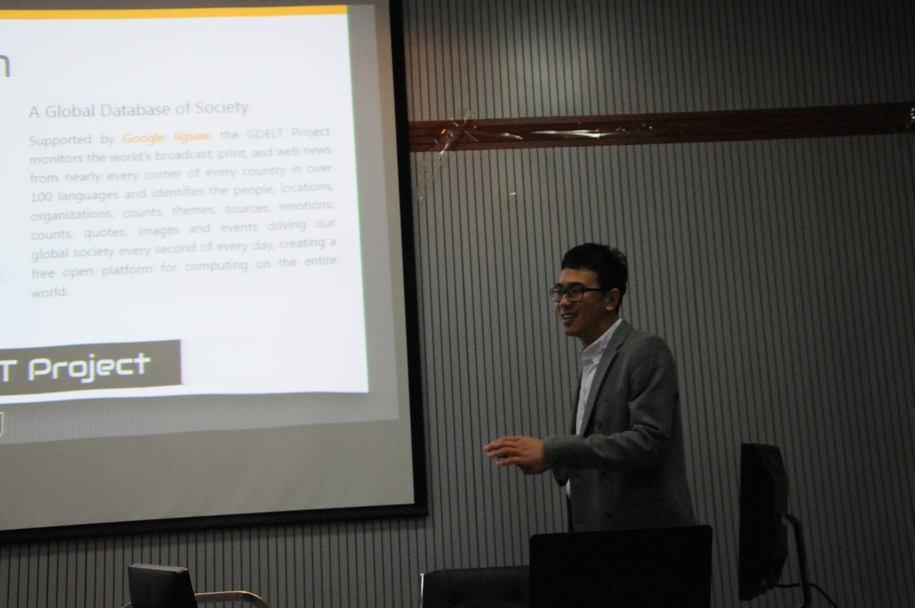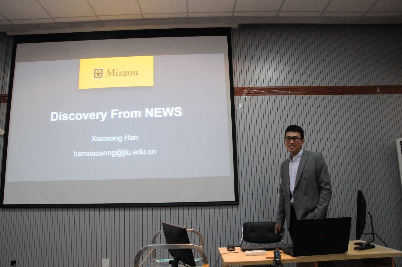 做了题为“基于新闻的大数据挖掘”的学术报告。报告主要介绍了韩霄松老师在美国访问学者期间取得的一系列关于新闻大数据挖掘的研究成果。报告中,韩霄松老师首先介绍了研究动因和新闻大数据的数据来源,然后重点介绍了利用这些数据做的两方面工作。首先是利用深度学习网络对疾病关注度趋势进行预测,并用可视化工具将疾病与关注度之间的关系进行了展示。另一项工作是结合情感分析技术,分析相关的新闻大数据对热点人物进行分析评价。并通过评价时间轴的波动情况进行新闻数据回溯,验证评价准确性。
