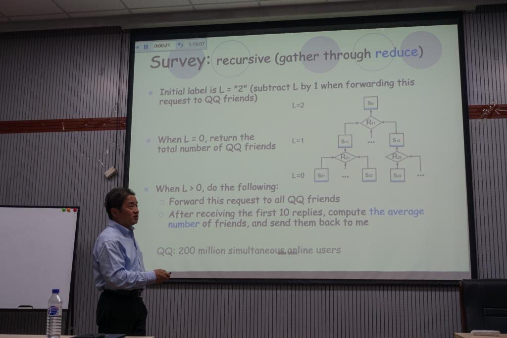 吴杰教授首先介绍了Crowdsourcing的历史,并指出它的益处以及大数据下相应的应用。然后详细地阐述了Crowdsourcing中的一些模型和算法,最后分享了在大数据应用下的挑战。在报告的最后,听众们与吴杰教授进行了热烈的讨论,吴杰教授对大家的问题进行了细致和耐心的讲解,让大家受益匪浅。整个报告会持续一个半小时,好多听众都是在站立中听完吴杰教授的讲座,这也说明讲座的精彩程度。
