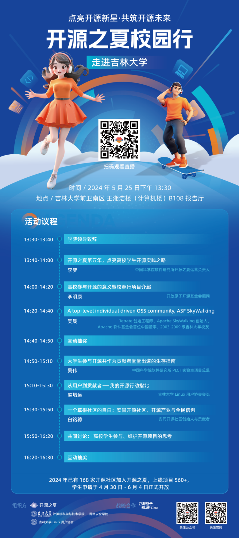 ,为同学们带来 6 场系列报告,从多个角度为同学们了解开源、参与开源提供指导和机会,深入探讨学生、高校与开源社区的关系,活动现场更有大量精美纪念品抽送!