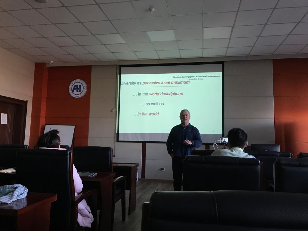 在报告中,Fausto教授介绍了对世界中的同一个实体的描述的多样性。Fausto教授的报告结构清晰,首先提出一系列的问题,即对于世界上的知识,没有先验的、通用的协议;然后提出问题的影响,比如对于知识整合(本体,schema)、数据集成、联邦学习等问题的影响;第三,提出问题的解决方案--iTelos方法,并介绍了其主要步骤和理论基础。介绍了知识图谱的概念以及各大通用知识图谱的共同功能性特点,解决特定领域知识多样性等问题。当今的知识图谱有一个共同的跨领域的目标,而且不能用于浏览大量的稀疏的、多样的、细粒度的面向应用的跨领域的数据。报告最后,Fausto教授悉心解答到场师生的提问,本次报告受到了广大师生的一致好评。