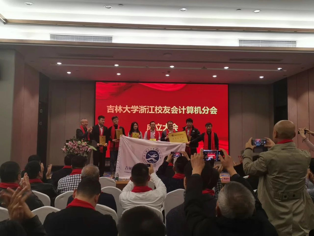 党委副书记高战国、吉林大学浙江校友会秘书长吴建文共同为计算机分会成立授牌、授旗)