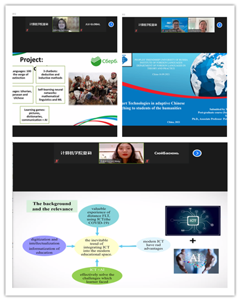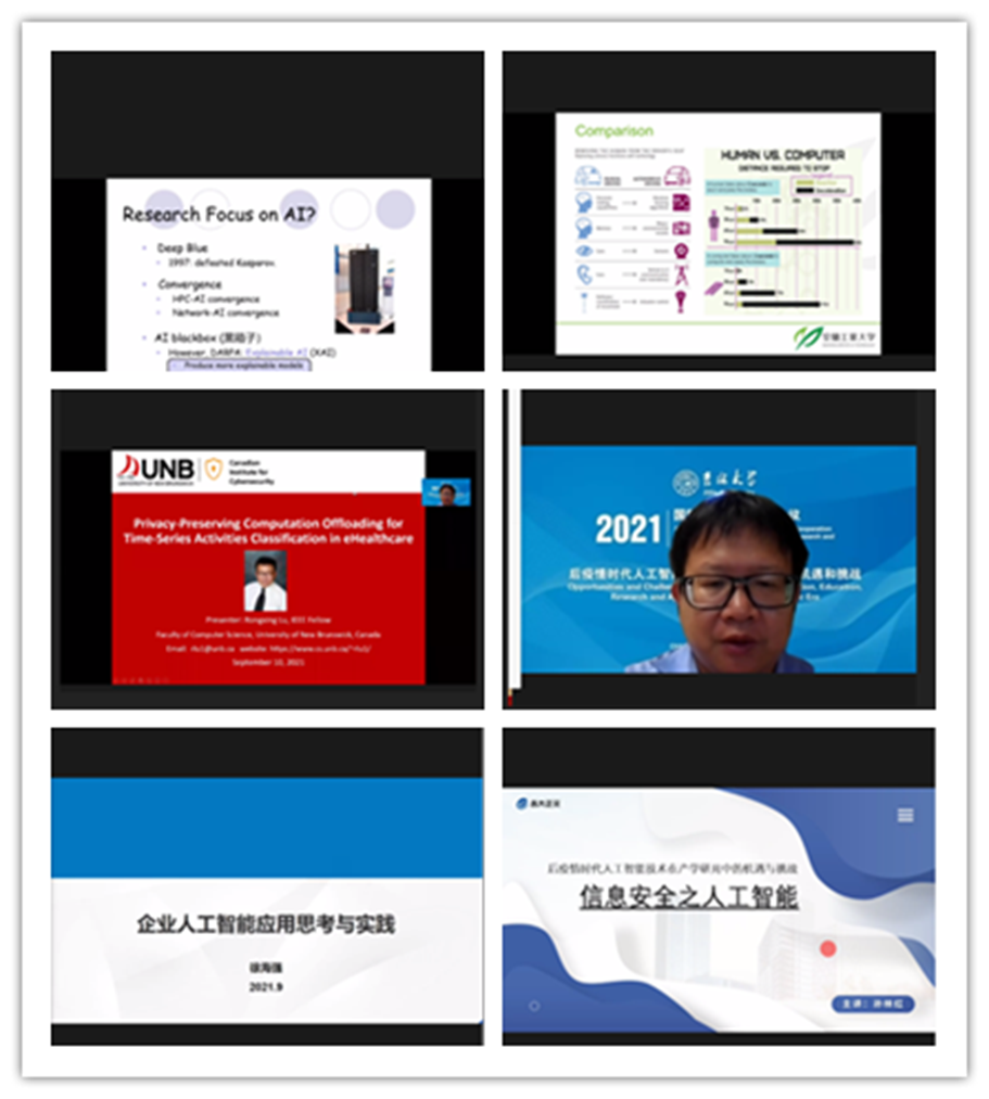 国际事务部主任Jie WU教授,日本工程院外籍院士、日本室兰工业大学副校长董冕雄教授,加拿大新不伦瑞克大学的Rongxing LU教授,中国一汽集团数字化部徐海强主任和中国吉大正元创新中心科学家孙林红高级研究员,俄罗斯人民友谊大学Marina Petrova教授,Baoyun XU博士,Shixian WANG博士等做了精彩的学术报告。报告讲座主题包括“How to Balance Teaching, Research, Service, (and Administration)”,“Privacy Preserving Computation Offloading for Time-Series Activities Classification in eHealthcare”,“Towards post pandemic era: empirical decision-making system for autonomous vehicles”,“企业人工智能应用思考与实践”,“后疫情时代人工智能技术在产学研用中的机遇与挑战:信息安全之人工智能”,“Creating an Individual Educational Trajectory of Students in AI conditions”,“Smart Technologies in adaptive Chinese teaching to students of the humanities”,“Information and communication technologies with elements of artificial intelligence in foreign language teaching at a university”。讲座主要针对后疫情时代的AI应用,从学术界和工业界的角度,围绕计算机领域前沿展开讨论。参会人员对每场讲座都抱有极高的热情,学术交流氛围浓厚。