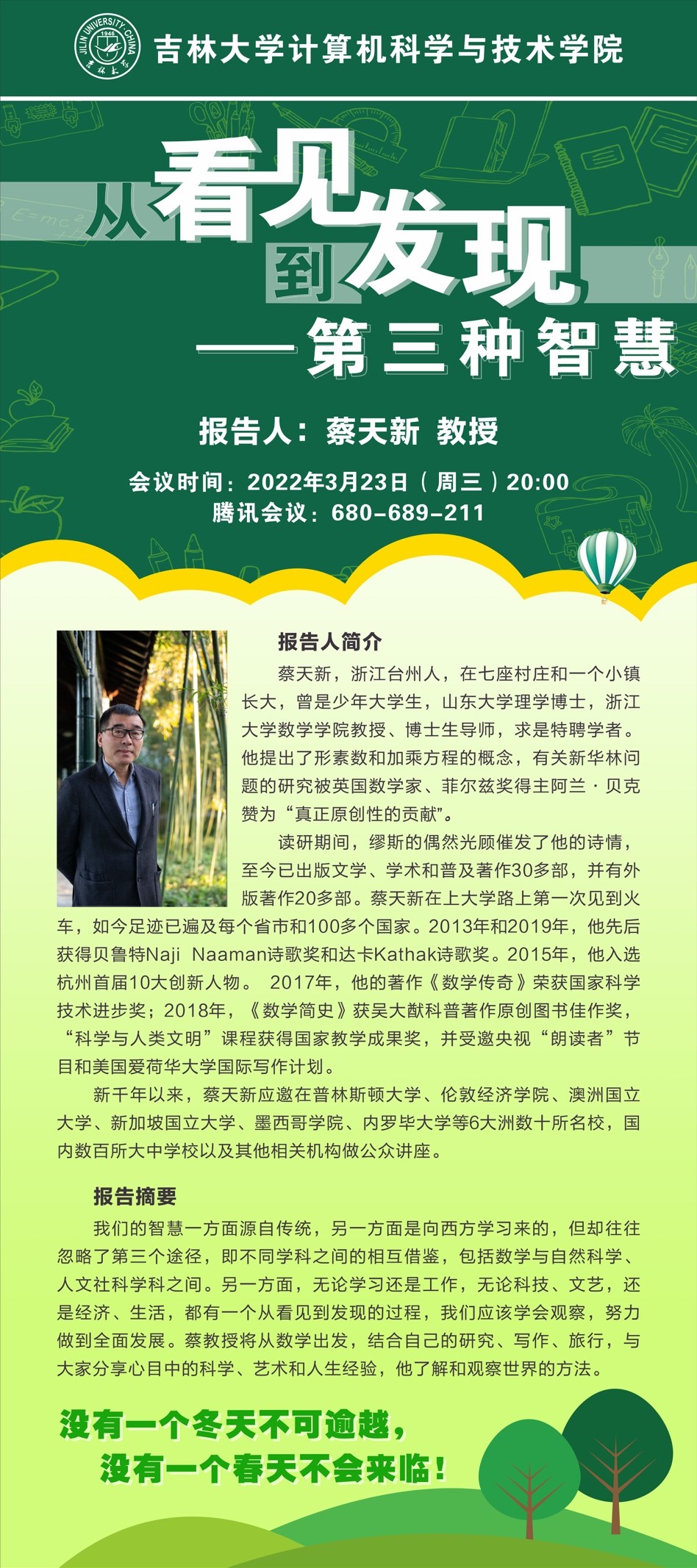 教授、博士生导师、求是特聘学者、数论学家,诗人、作家蔡天新先生应富豪娱乐城