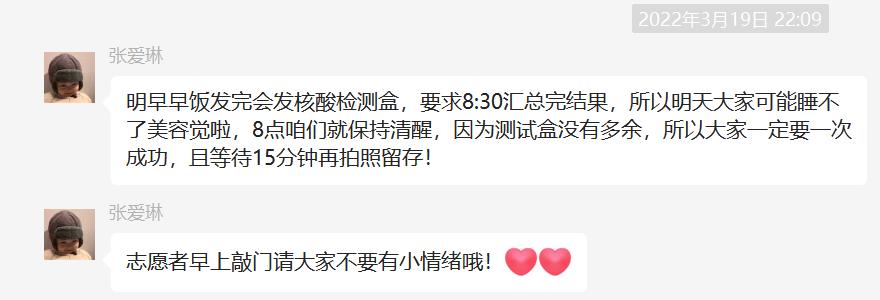 的防疫要求,大家每天早上都需要按时提交抗原自测结果,同学们不免需要在睡眼惺忪的时候起床检测。每每这时候,志愿者负责人张爱琳总是和平常一样,细心温柔地叮嘱大家,瞬间安抚了同学们的情绪。