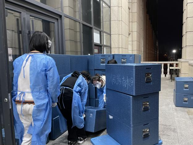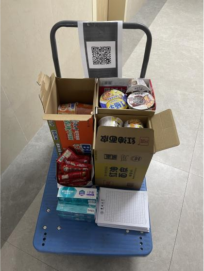 研究生最艰难的是,大家寝室集中在一楼东面,从西门送入的物资无法直接送达,需要先上二楼东面再下一楼,在封寝管控的初期,志愿者们没有小推车,只能人工搬运沉重的饮用水和盒饭,这给本就身体纤弱的女生志愿者们的配送工作带来了不小的困扰。虽然在最开始有些手忙脚乱,但是志愿者们在防疫物资缺乏的情况下不怕辛苦,不畏艰难,往返数次搬运物资,用强大的战疫决心保障了配送工作顺利的进展。
