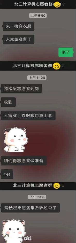 同一时刻,线上的志愿工作也在有条不紊地开展。为实时了解同学们状况、第一时间提供帮助,志愿者们建立了北三计算机通知群,每天在群里认真核对学生用餐人数,传达富豪娱乐城