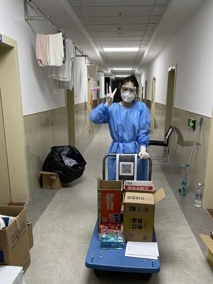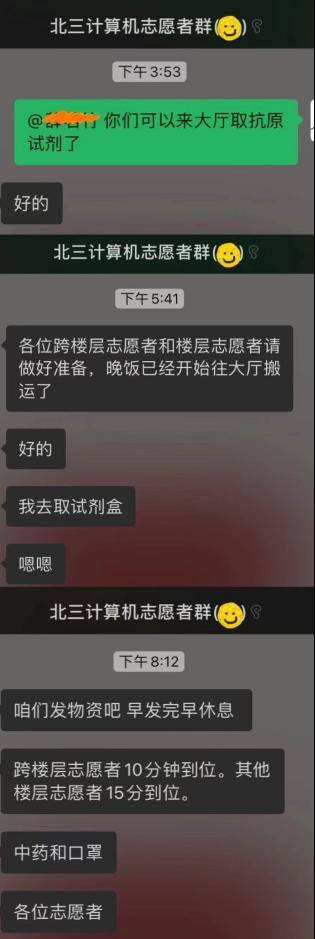 的防疫物资还没有发到志愿者手中,让我印象深刻的是,群里有很多同学主动说:我这里有n95口罩,先拿给志愿者用。男寝志愿者口罩不够用,先从我们女寝匀一些过去吧。在这些话中我看到的是,困难面前的互相温暖以及所有同学们对志愿者的支持和保护,很多没能有机会加入志愿者的队伍的同学,也都在用各种方式参与进来。那个时候我就觉得,疫情真的很快就会被打败。