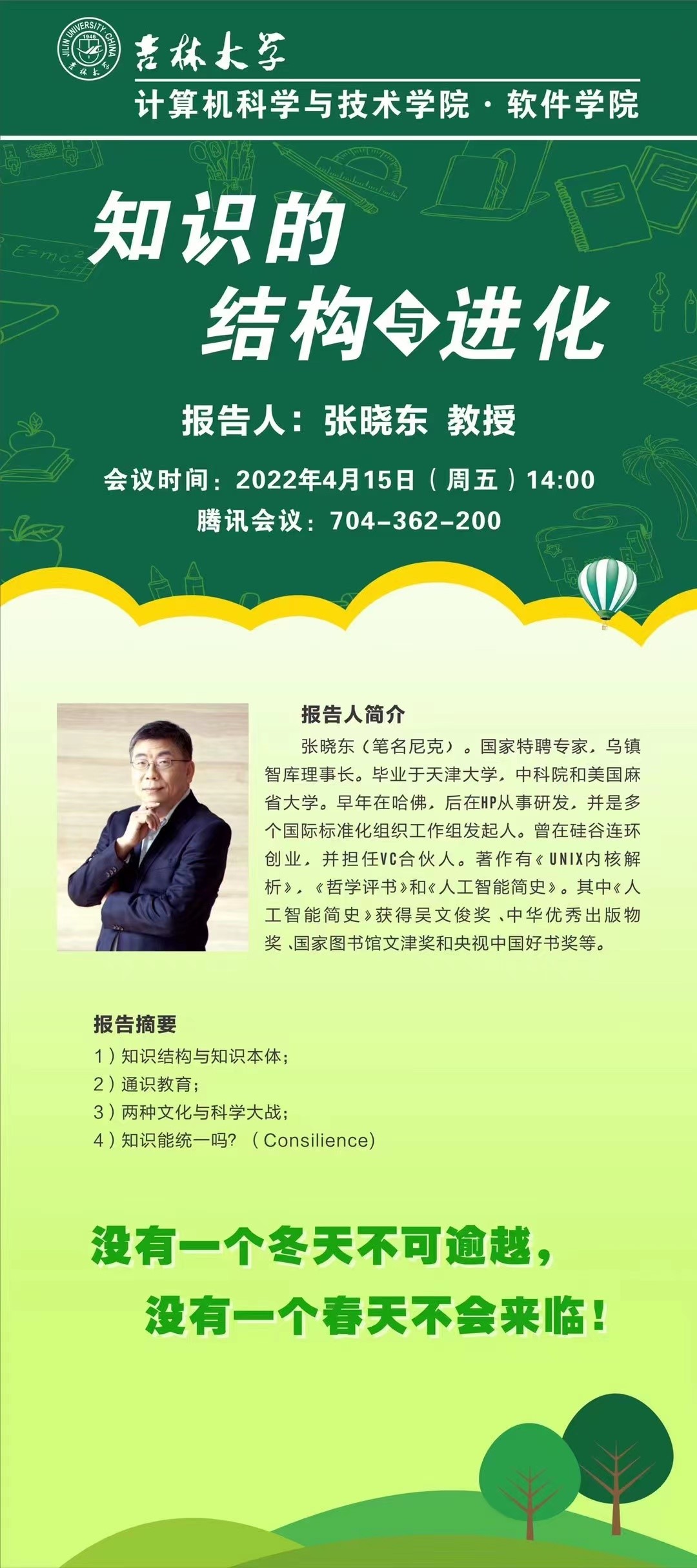 2022年4月15日14:00,国家特聘专家张晓东教授应邀利用腾讯会议作了题为“知识的结构与进化”的学术报告,也是本科生综合素质提升计划系列报告的第十场。张晓东教授这次报告是应富豪娱乐城