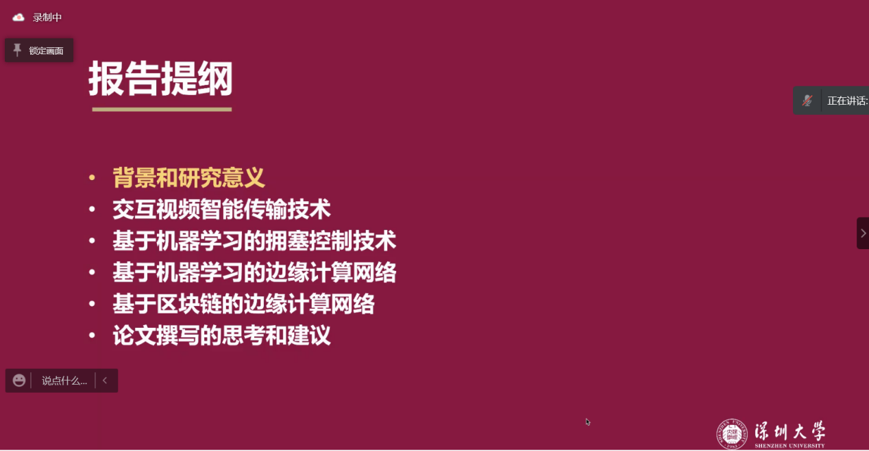上半场,崔教授先介绍了当前互联网安全与实时性面临挑战,而AI的快速发展为当前网络需克服的问题提供了解决手段。然后引入本节课分享的交互式视频的两项工作:建立在深度强化学习的直播流媒体传输控制以及360度视频的传输。从问题建模、理论基础、实现过程以及实验设置的对比方法、评判指标和参数配置,实验分析等方面,崔教授都为同学们进行了详细的讲解。接着又深入浅出地介绍了基于机器学习的高铁网络拥塞控制机制、基于机器学习的边缘计算网络、基于区块链的边缘计算网络三方面的相关工作。为我们展示了当前AI与计算机网络结合的前沿技术及成果。