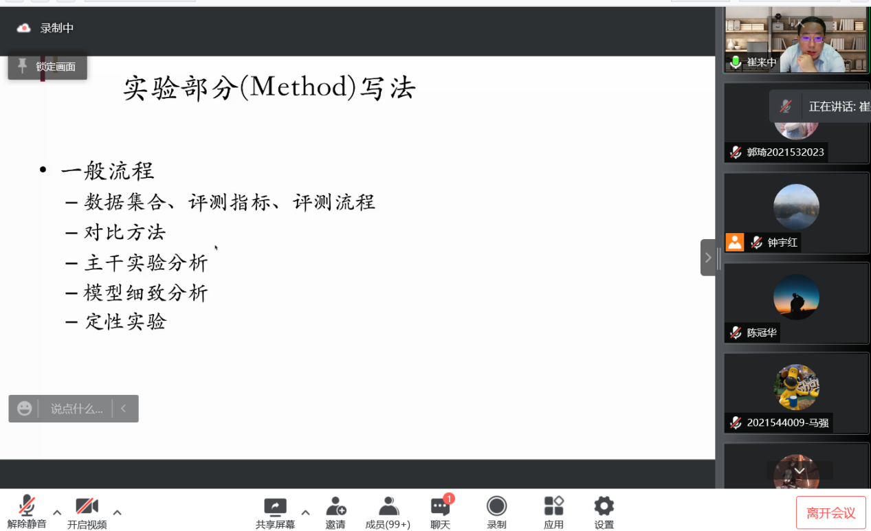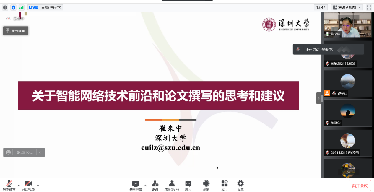 教授,博士生导师崔来中老师。崔教授以“关于智能网络技术前沿和论文撰写的思考及建议”为题目,为同学们带来论文写作指导课程的最后一讲,也意味着线上特别版研究生学术沙龙告一段落。