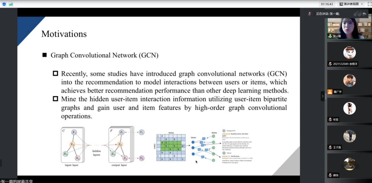 会议第二阶段,讲者张一嘉带来了以“推荐系统”为主题的论文分享。讲者说,目前推荐系统在各大电商平台中都有广泛的应用,一般可以通过用户对物品的历史评论来推测用户的偏好。但在基于评论文本的深度学习模型中,用户和物品的特征学习过度依赖文本中的语义特征,当评论数目稀疏时,模型不能很好地利用评论文本数据缓解稀疏性问题。此外,现有的研究还忽略了历史评分对于用户和物品特征表示的直接影响。针对以上问题,讲者提出了AGCR(Attributed GCN for Rating Prediction)模型,这是一个交互式的特征模型,通过属性图卷积方法,将评论与历史评分都作为交互关系,融合用户和物品特征表示中,在处理稀疏性的问题上有很好的效果,更好地构建了用户和物品特征表示的问题,提高了推荐系统中评分预测任务的准确性。