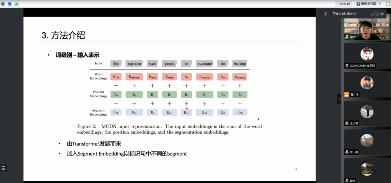 三位讲者汇报结束后,都向同学们分享了自己在学术工作中的经验。讲者刘家伦认为有好的idea后,要保持好的心情去工作,慢慢地进步与成长,不要着急或焦虑;其次要保证身体的健康,身体是革命的本钱。讲者张一嘉分享到,有想法方法后要敢于动手、勇于实践,只有实践才能证明方法的合理性和有效性。讲者梁世宁则针对期刊和会议的投稿分享了他的宝贵经验。