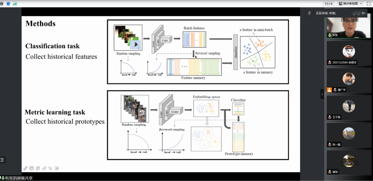 会议第一阶段,讲者刘家伦带来了以“长尾分布下的特征学习”为主题的论文分享。讲者首先介绍了长尾分布,这是一种数据不平衡的极端情况,例如在一个数据集中,种类多的数据被称为头部类,种类少的数据被称为尾部类,这样分布不均的情况深度模型的学习带来了巨大的挑战。针对这个问题,讲者提出了Feature Cloud,MBJMemory-based Jitter,MAUMMemory-Augmented Unidirectional Metrics)三种方法,缓解了尾部类数据在模型学习过程中类内多样性不足的问题,并在长尾特征学习以及长尾分类学习两个任务中都验证了方法的有效性。