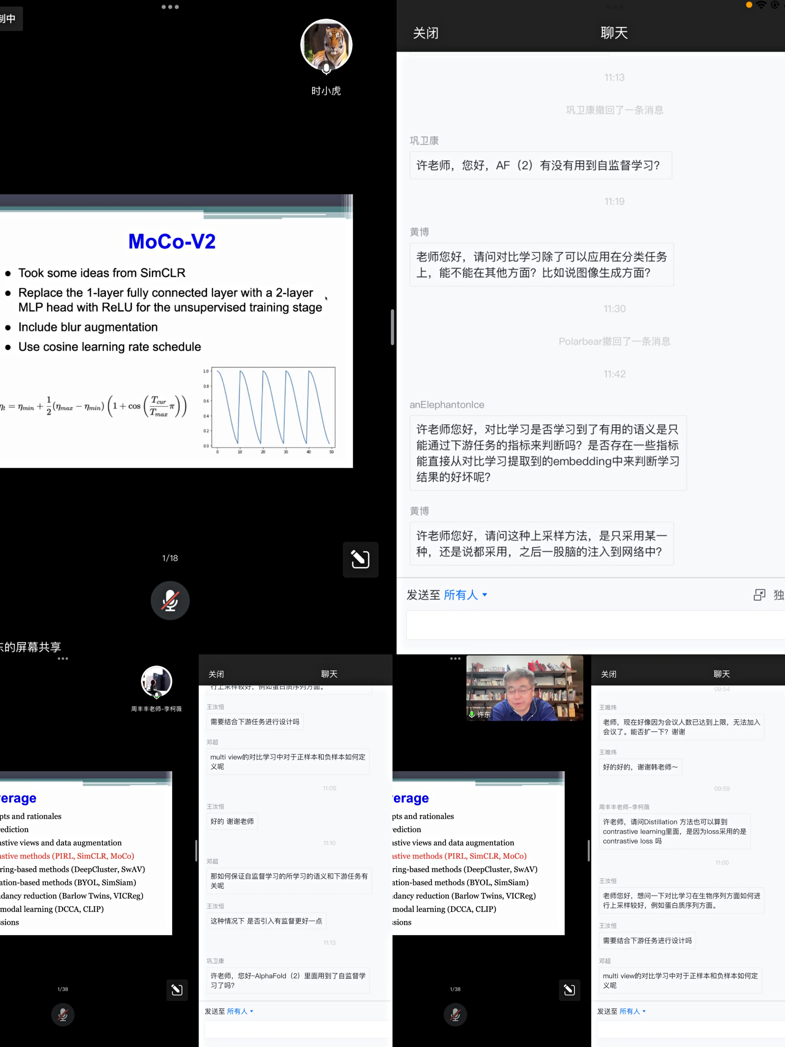 近年来,自我监督学习 (SSL) 通过利用大量未标记数据集获得有意义的语义表示,取得了令人瞩目的成功。SSL采用自定义伪标签作为监督策略,通过学习显著提高下游任务的性能。在本次报告中,许东教授由浅入深的带领大家回顾了三种主要的SSL方法,即自我预测、对比学习和减少冗余,许东老师也提供了各个方法的相关详细信息和比较,包括对比学习方法(PIRL,SimCLR,MoCo),基于聚类的方法(DeepCluster,SwAV),基于知识蒸馏的方法(BYOL,SimSiam),减少冗余方法(Barlow Twins,VICReg)和多模态学习方法(DCCA,CLIP)。