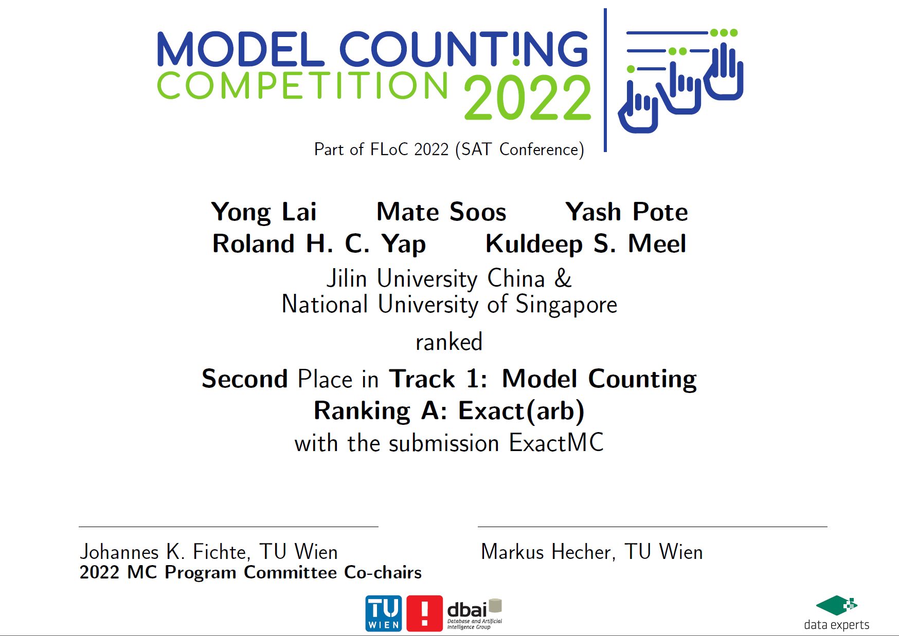 在今年的模型计数竞赛中,赖永副教授提交的ExactMC求解工具获得无权组亚军。和往年一样,模型计数竞赛伴随SAT会议(CCF推荐为B类会议)一起举办。获悉,无权组是今年模型计数竞赛中竞争最激烈的赛道,竞争者来自美国加州大学洛杉矶分校、新加坡国立大学、日本名古屋大学、挪威卑尔根大学、芬兰赫尔辛基大学、法国阿尔图瓦大学等知名高校的人工智能研究人员。