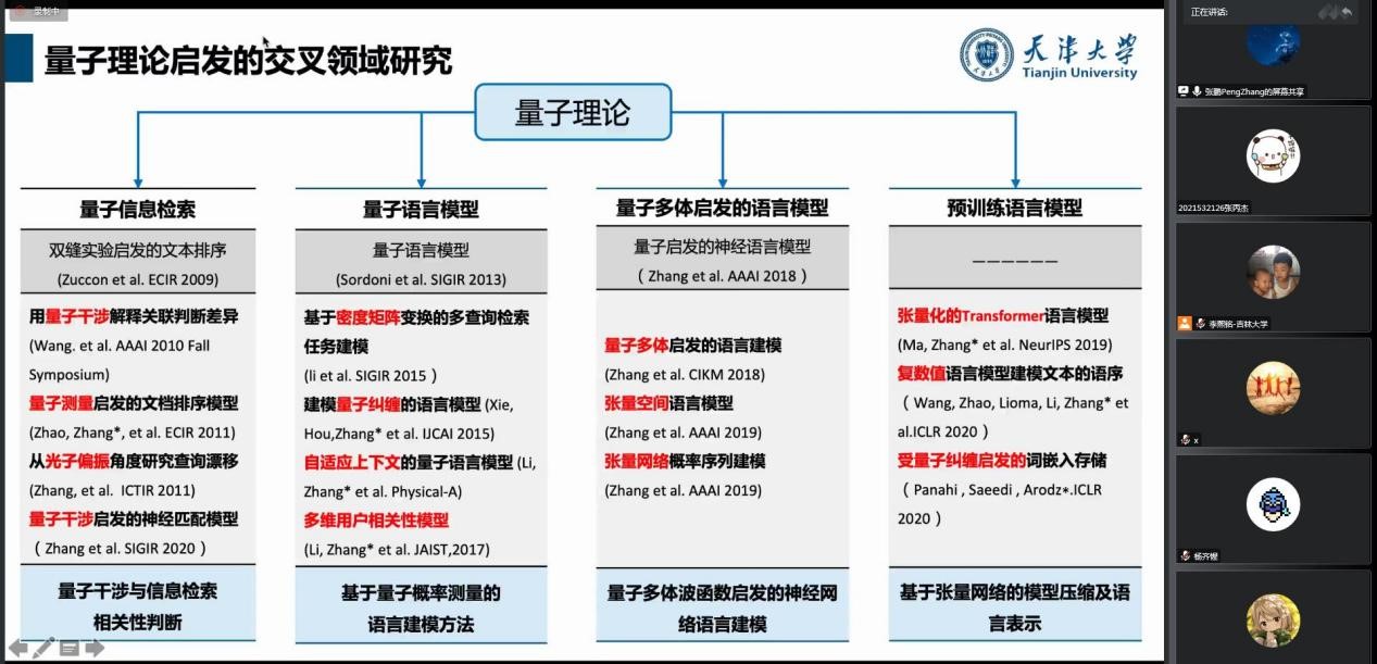在讲座中,张鹏老师首先介绍了量子理论的基本知识,近年来,量子理论和人工智能的交叉研究越来越受人们的关注,量子理论已经逐步应用于社会科学、认知科学、信息检索和自然语言等领域。张鹏老师通过语言学中的“量子纠缠”现象--互文逐步介绍了量子理论启发的交叉领域研究(例如:量子信息检索、量子语言模型、量子多体启发的语言模型和预训练语言模型)。随后,针对自然语言的量子不确定性关键科学问题,介绍量子自然语言处理的前沿进展以及未来将面临的挑战。