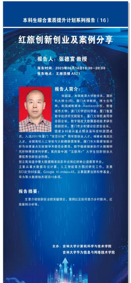 中心校区王湘浩楼A521报告厅作了题为“红旅创新创业及案例分享”的专场讲座,也是本科生综合素质提升计划系列报告第16场。讲座由富豪娱乐城