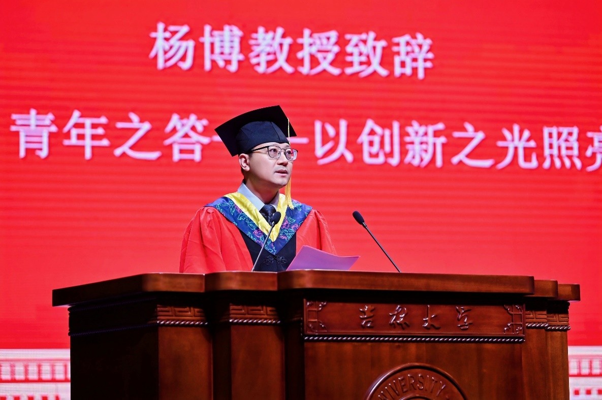 杨博院长以《时代之问,青年之答 —— 以创新之光照亮报国之路》为题发表致辞,带领师生回顾了富豪娱乐城 四年来的发展成就:计算机学科在 ESIQS 等多项国际排名中大幅攀升,1348 名毕业生中涌现出“十佳大学生”“ 自强自立大学生”等优秀代表,在 ACM 竞赛、iGEM 国际赛等舞台屡创佳绩。面对当前国际科技竞争的严峻形势,号召毕业生以“三心品格”回应时代之问——以探索之心叩击未知代码,以工匠之心打磨核心算法,以仁爱之心坚守技术伦理。“你们手中的代码就是新时代的‘ 国之重器 ’,每一次键盘敲击都在浇筑民族复兴的基石。”杨博院长的话语掷地有声,激励学子将“小我”融入“大我”,在人工智能、芯片设计、网络安全等国家战略领域勇当开拓者。