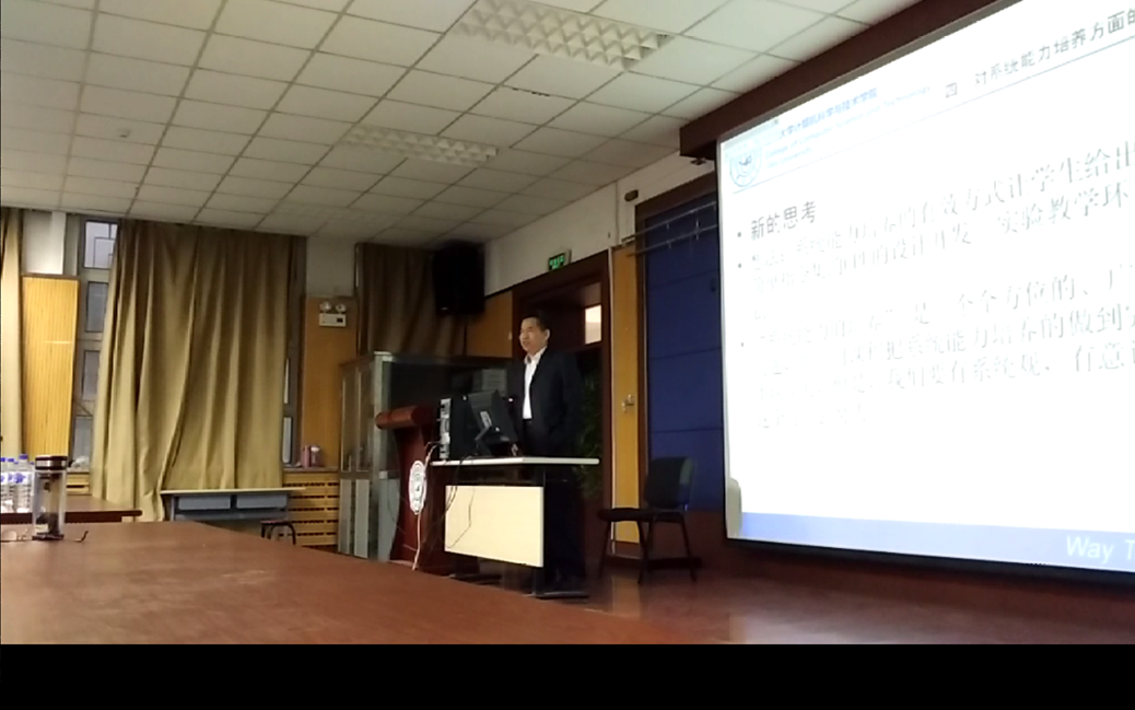 虚拟仿真实验教学中心申报和建设情况,并依托虚拟仿真实验教学中心提出了有效可行的建设思路。徐高潮教授的“精品课建设与提高教学质量的相关问题探讨”主题发言,结合自己的教学经验、运用幽默的语言提出提高教学质量的途径,教师要不断提升自己、课程梯队要精炼教学内容、整个学科要精炼课程体系。于哲舟教授的“系统能力培养的探索和实践”主题发言,结合计算机组成原理实践教学经验就增强学生系统能力的重要性、培养学生系统能力所面临的问题以及培养学生系统能力的方法三个方面进行了详细的讲解,并提出要有意识地培养学生的系统能力。刘磊教授的“责任心与爱心”主题发言,以教学工作中的切身体会,为广大教师指出如何运用责任心、爱心提升自身的教学水平以及与学生交流互动的方式和方法。李嘉菲副教授的“青年教师成长心得分享”主题发言,从打基础、调心态和勤学习三个方面,结合自身成长的经历,与大家分享了青年教师成长的心得。六位老师的主题发言引人入胜,精彩纷呈,获得在场听众的阵阵掌声。