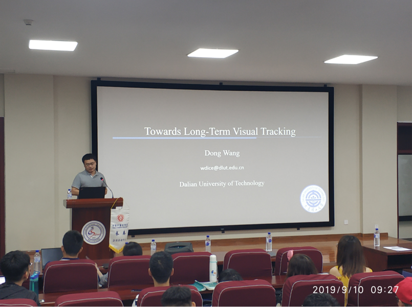在报告中,王栋老师提到,近年来在线视觉跟踪研究已取得突破性进展,跟踪精度和速度在OTB和VOT等短时跟踪数据库上均取得了非常出色的表现。然而,针对长时视觉跟踪问题的研究及相关Benchmark的建立刚刚起步。长时视觉跟踪不仅包含传统跟踪问题中的难点而且存在目标频繁消失并重新出现这一新的挑战。因此,要求跟踪算法同时具备短时精准快速跟踪和长时全图重找回的能力,以及判断目标是否被跟踪或已丢失的能力。在本次报告中,王老师以其团队在VOT2018长时比赛冠军算法和ICCV2019最新接收论文为基础,介绍了长时视觉跟踪前沿进展以及深度学习算法在长时目标跟踪问题上的初步探索。本次报告受到在场师生们的一致好评。