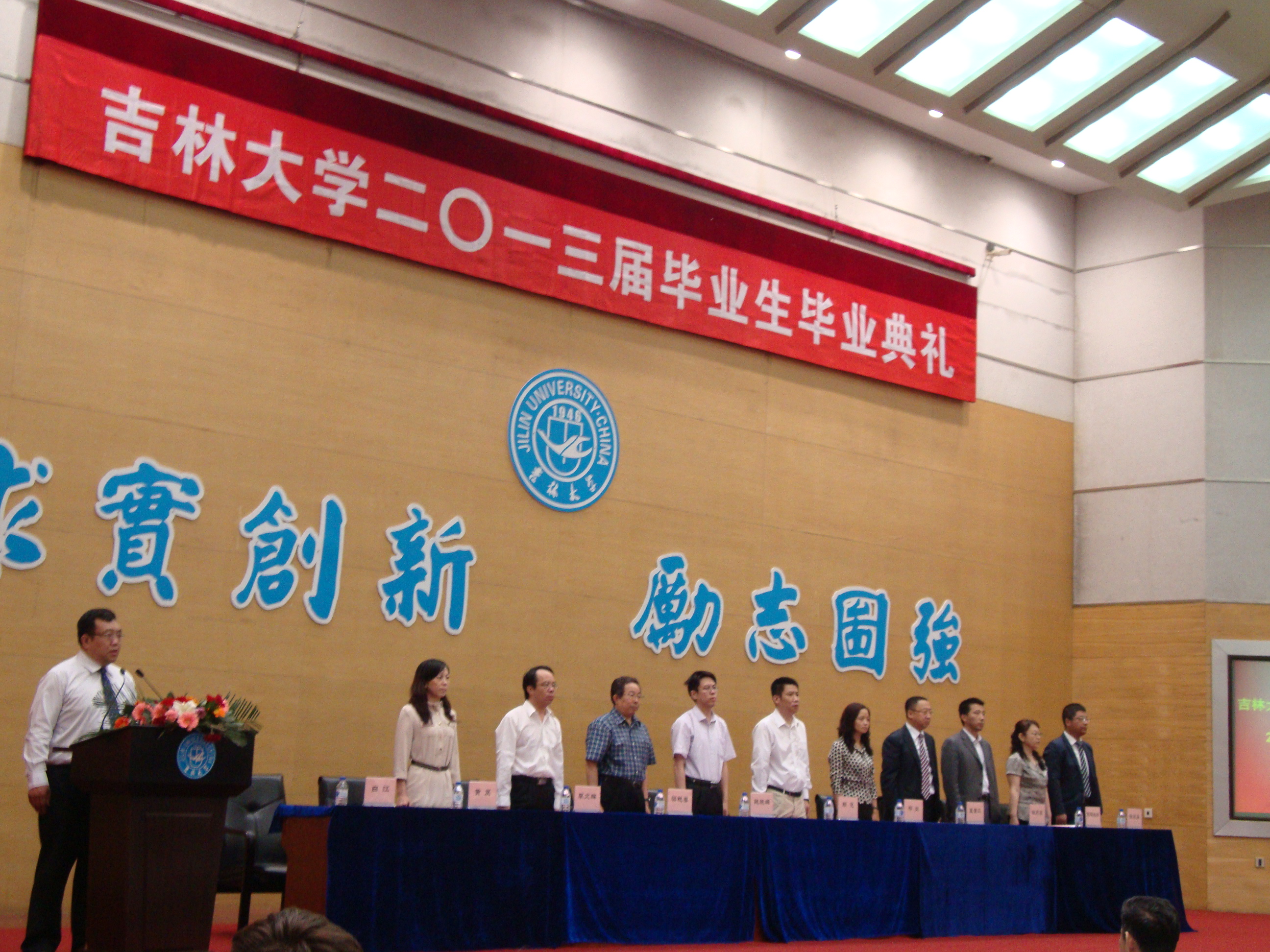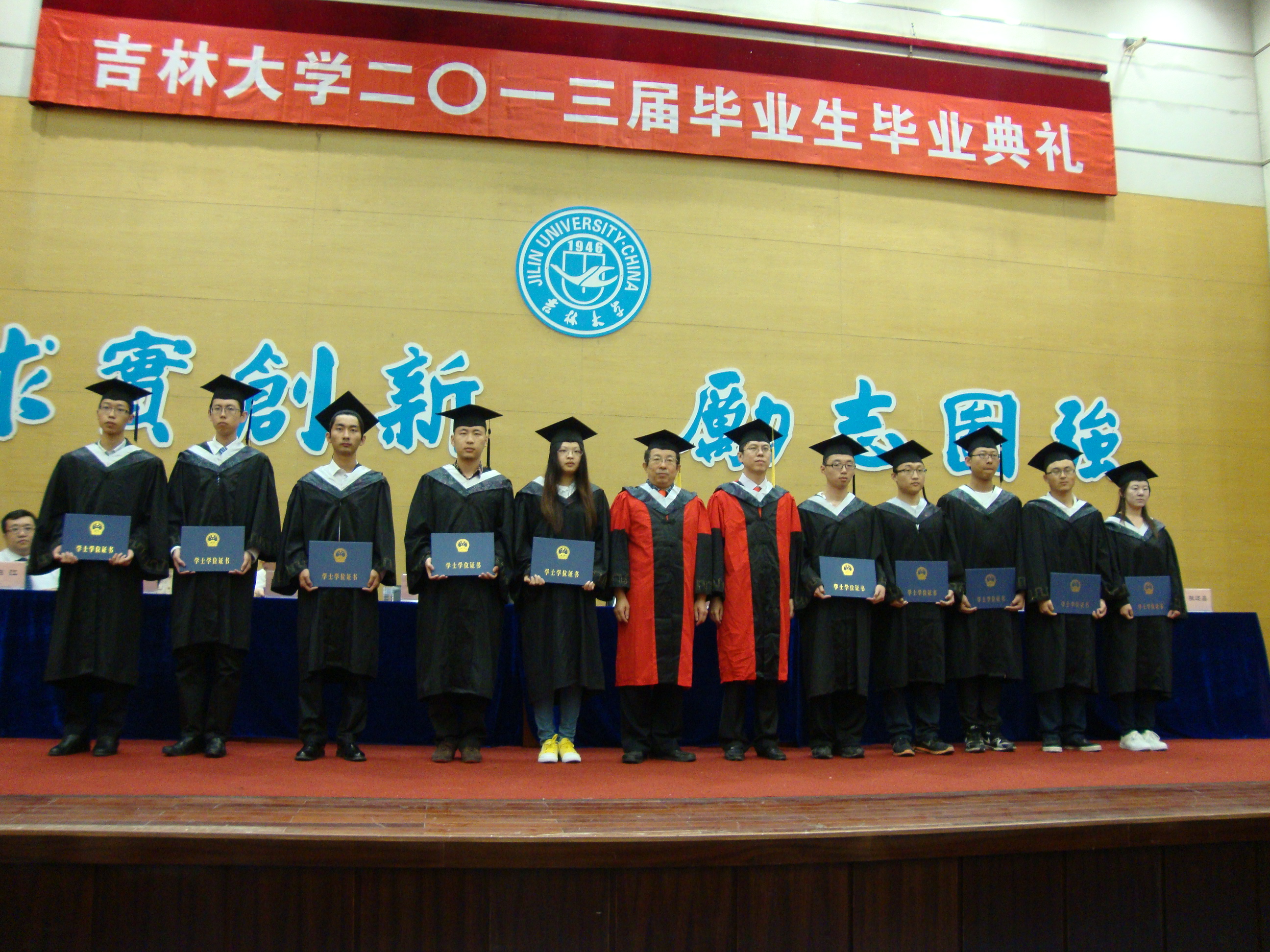 学位评定分委员会委员梁艳春教授一同上台,为取得学士学位、硕士学位和博士学位的毕业生代表授予学位,颁发学位证书并合影留念。
