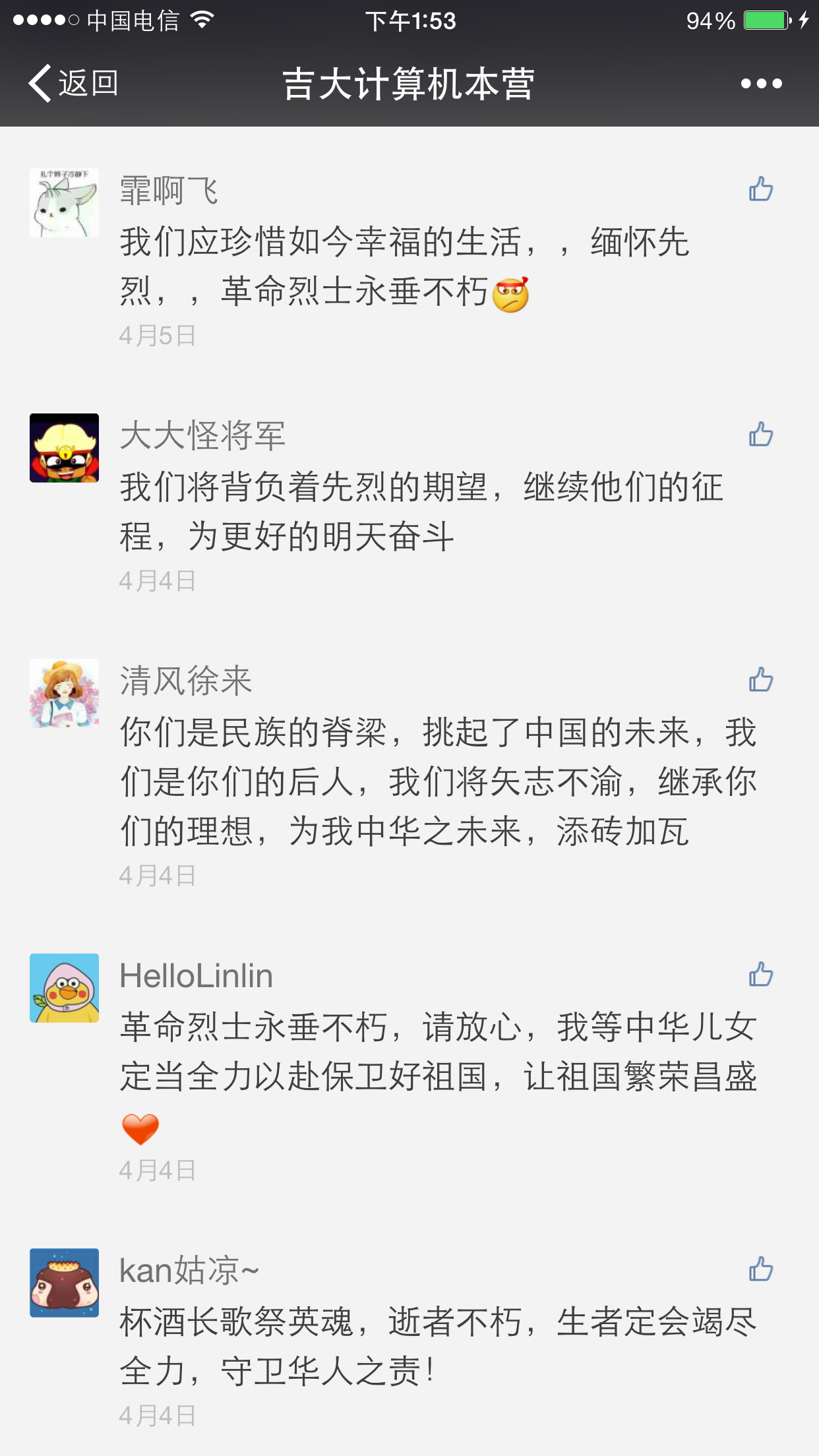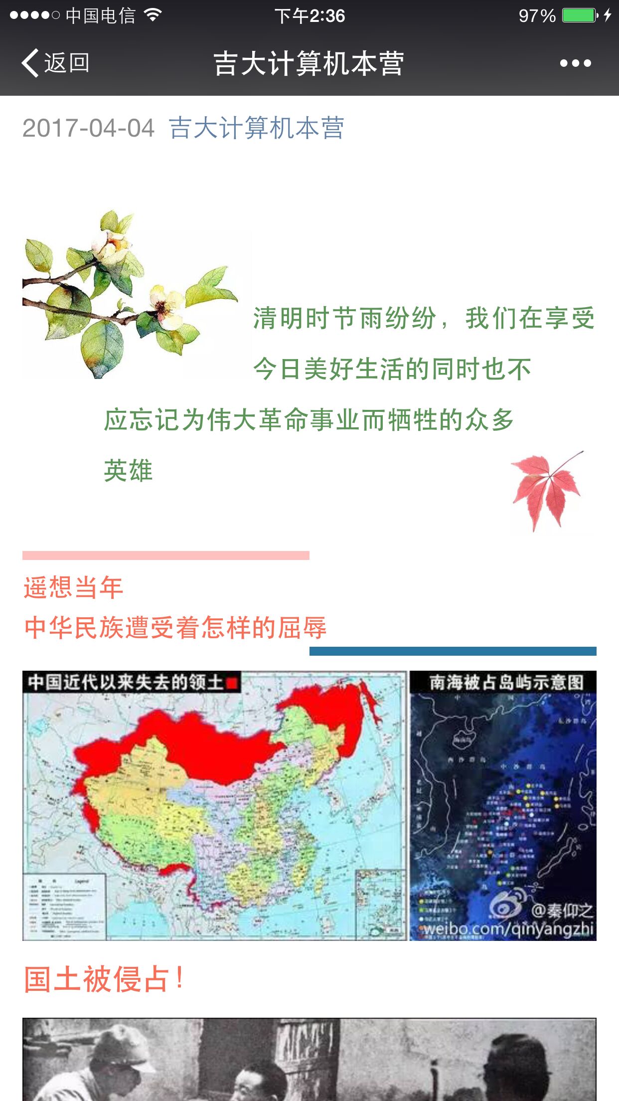 信息部在“吉大计算机本营”微信公众号上推送了一篇关于倡导清明节追悼先烈活动的文章。该文章一经发布,随即获得全校师生的广泛关注。