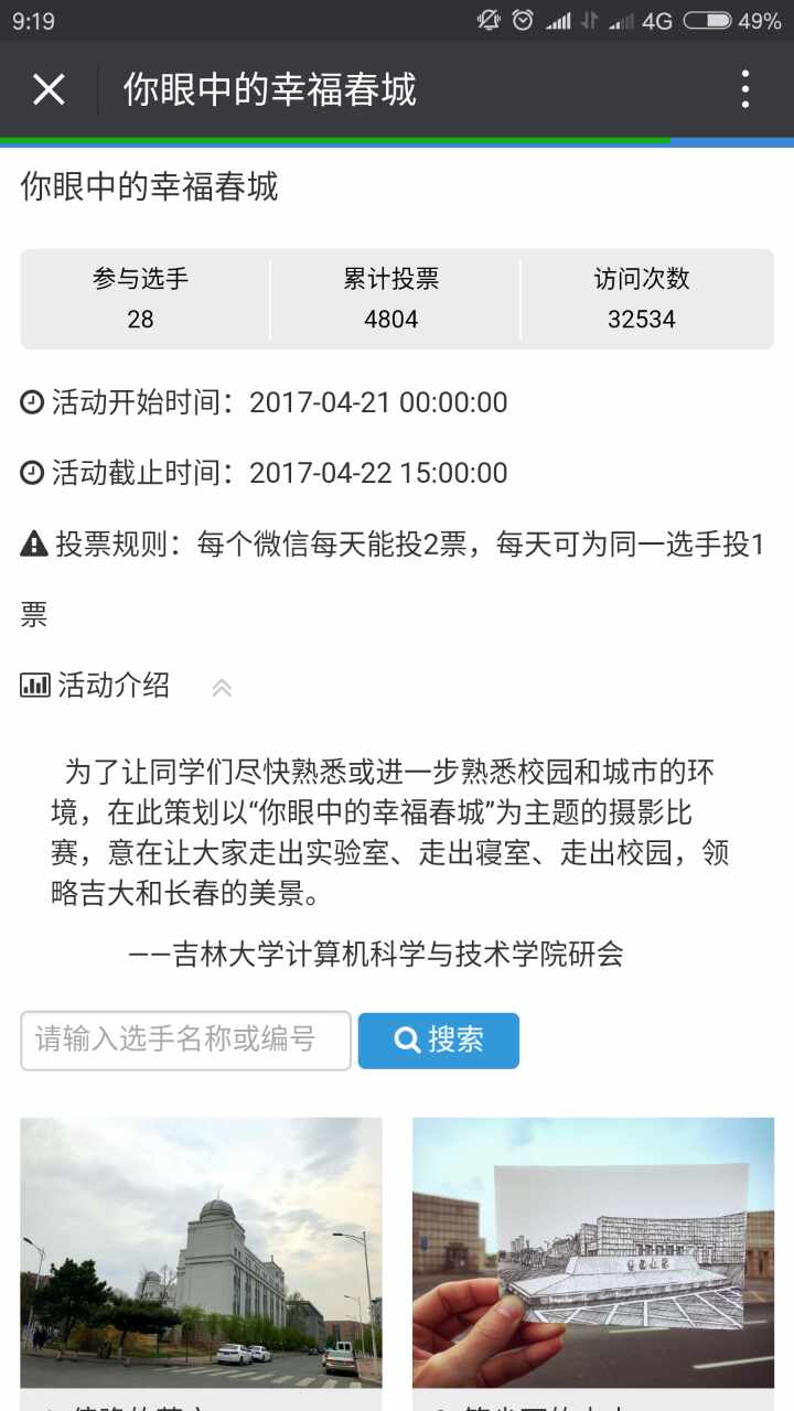 研会外联部,宣传部于4月15日至4月22日举办了以“你眼中的幸福春城”为主题的摄影比赛,意在让大家走出实验室、走出寝室、走出校园,领略吉大和长春的美景。并于4月23日在计算机楼举行了颁奖仪式。