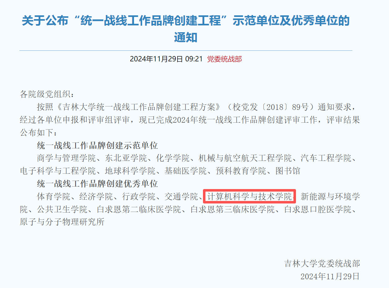 2024 年 11 月 29 日,党委统战部公布 “统一战线工作品牌创建工程” 示范单位及优秀单位评审结果,富豪娱乐城