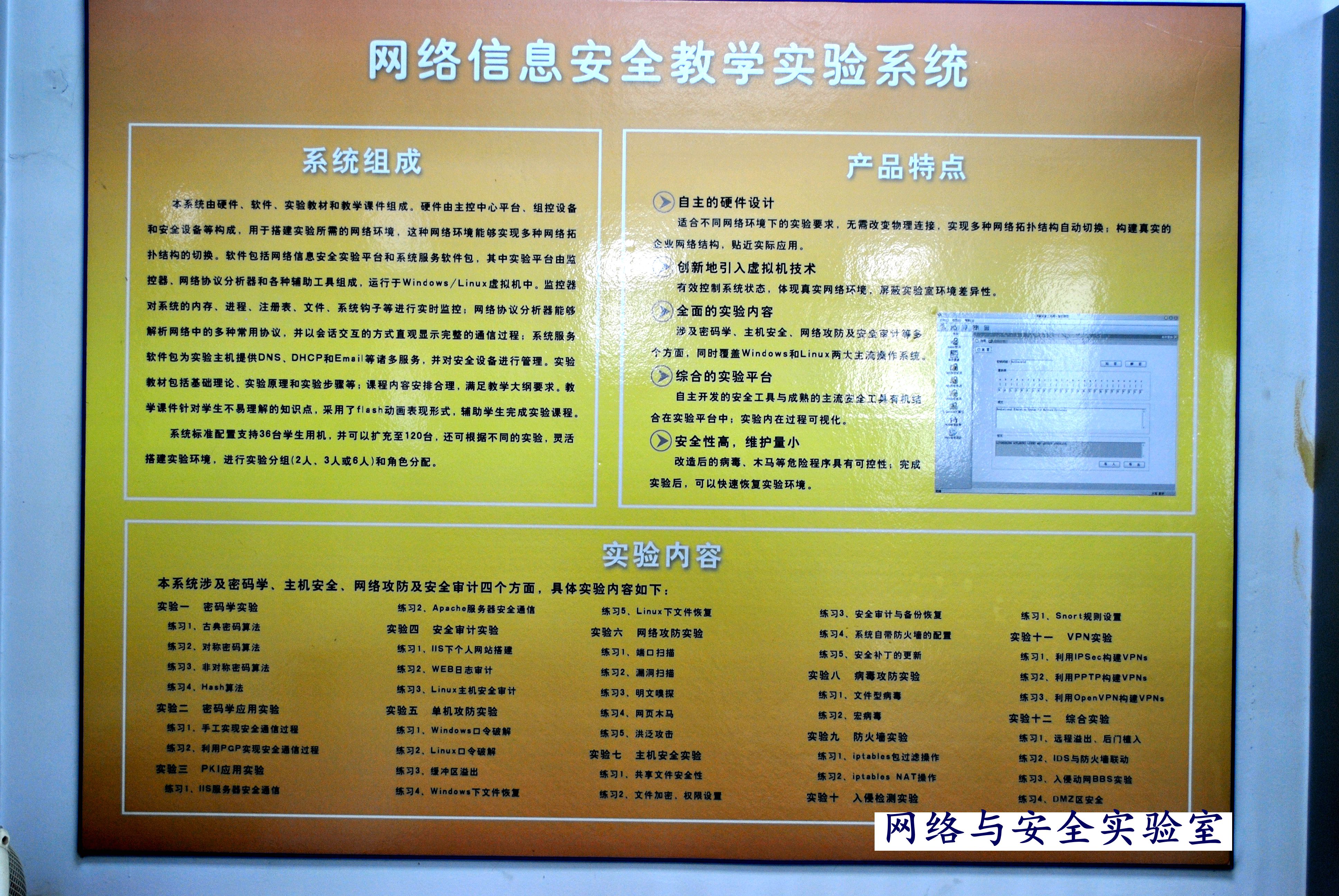 网络与安全实验室由A227 、A230、B312三个实验房间组成,总面积562平方米,可同时容纳二百二十名学生上机做实验,实验室有各项完善的规章管理制度,有专职实验人员五人,其中高工三人,工程师两人。A227、A230为网络协议分析与故障诊断实验室,是基于富豪娱乐城 与吉大中软公司合作研发“网络协议仿真教学系统”平台上进行的实验课。该实验独立设置、单独计入1.5学分,共计32 学分、36个实验项目。实验项目由必修课14项和选修课22项组成,其中必修课设置为计划内的实验学时,选修课设置为计划外的实验学时,验证型、设计型和综合型实验类型各占比例分别为22%、22%和56%。B312为网络与信息安全实验室,主要是面向信息安全专业的本科生开展实验课,一部分课时面向物联网工程专业和软件工程专业的本科生。网络与信息安全实验教学平台,主要由主控中心平台、安全设备、组控设备、无线组控设备、应用服务器和管理服务器组成。根据不同层次的教学需要,可搭建成实验教学所需的网络环境,可以灵活实现多种网络拓扑结构,详见(实验平台结构框图)。